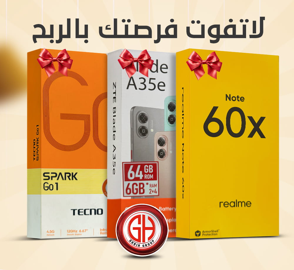 ثلاث هواتف بانتظار الرابحين ! ادخل السحب الشهري الآن .... عند شرائك موبايل جديد ستحصل على قسيمة تخوّلك دخول السحب على إحدى الجوائز التالية: 📱 هاتف Realme Note 60X 📱 هاتف TECNO Spark Go 1 📱 هاتف ZTE Blade A35e 🚗 وليس هذا فقط! سيدخل اسمك تلقائياً أيضاً في السحب السنوي على الجائزة الكبرى : سيارة جديدة موديل 2026 🎁🔥