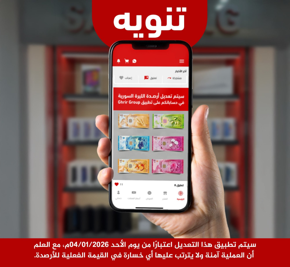 نود إعلامكم بأنه سيتم إجراء تحديث على أرصدة الليرة السورية في حساباتكم ضمن تطبيق Ghrir Group كما سيتم تعديل أسعار جميع المنتجات بما يتوافق مع العملة السورية الجديدة وذلك عبر حذف صفرين من الأرصدة المتوفرة داخل التطبيق ومن أسعار المنتجات المعروضة.سيبدأ العمل بهذا التعديل اعتبارًا من يوم الأحد الموافق 04/01/2026م علمًا أن هذا الإجراء تقني فقط وآمن بالكامل ولا يترتب عليه أي تغيير أو خسارة في القيمة الفعلية للأرصدة