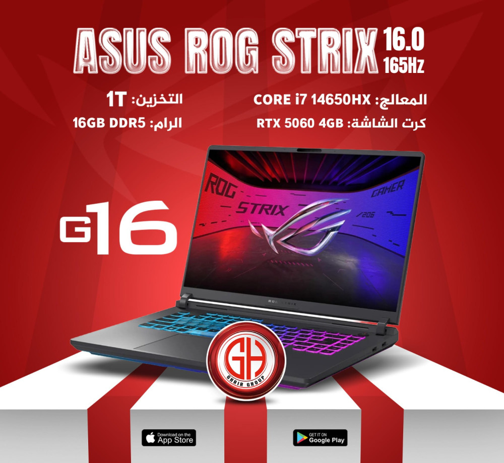 وة لا مثيل لها وأداء لا يُعلى عليه! 😮⚡احصل على لابتوب ROG Strix G16 من العملاقة ASUS 🎮الخيار المثالي للألعاب الحديثة 💥 والأعمال الاحترافية 🚀أداء قوي، شاشة سريعة، وتصميم RGB مذهل ✨لابتوب واحد… لكل شيء 💪💻🖥️ المواصفات:⚙️ المعالج: Intel Core i7-13650HX🎮 كرت الشاشة: NVIDIA RTX 4070 8GB GDDR6💾 الرام: 16GB DDR5 4800MHz📦 التخزين: 512GB M.2 PCIe NVMe🖥️ الشاشة: 16.0” QHD+ 240Hz 🔥سعر المنتج 1450$